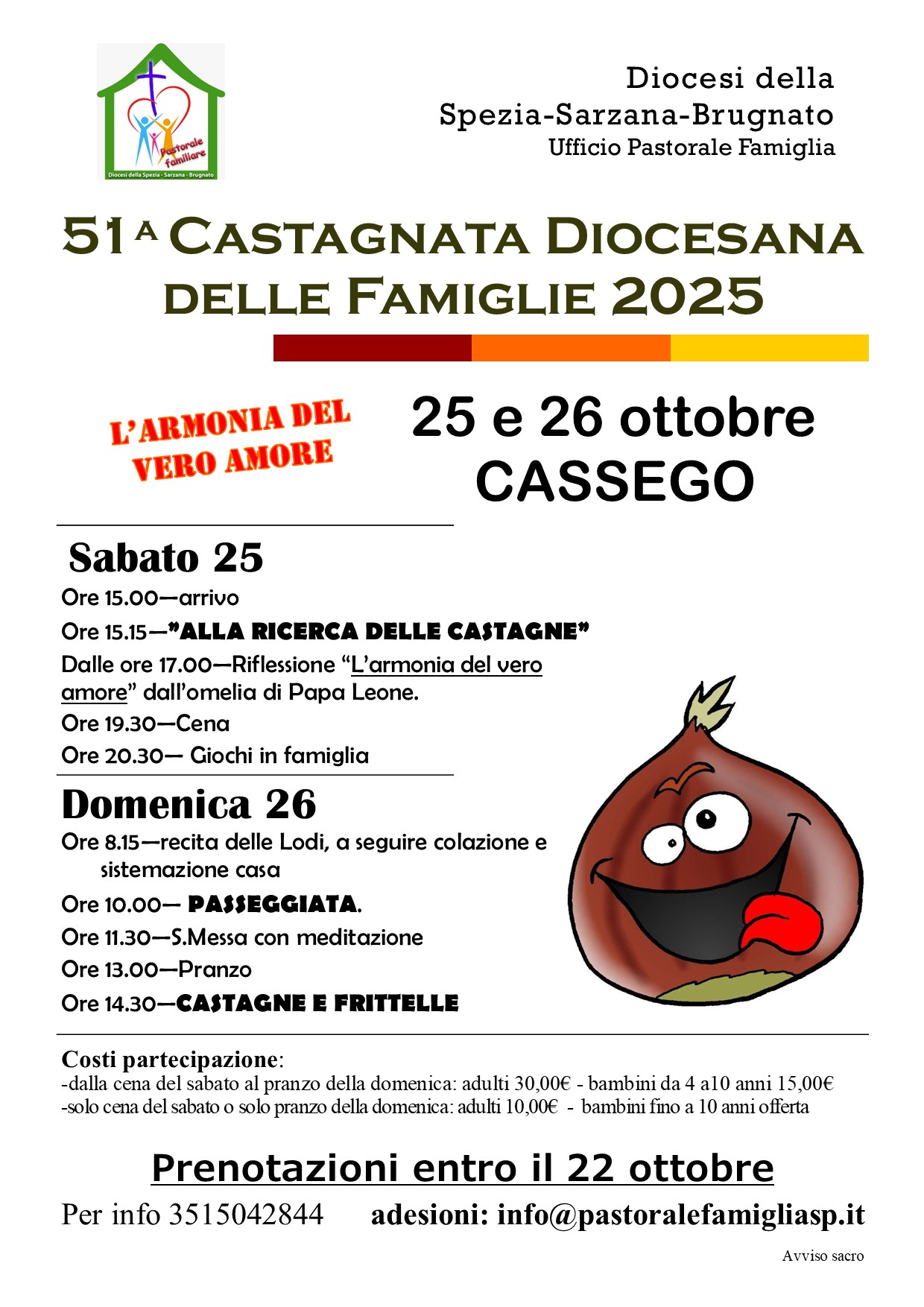 Ritorna la tradizionale “Castagnata delle Famiglie” organizzata dall’Ufficio Pastorale Famiglia diocesano a Cassego presso la “Casa San Pio X”, questa è la 51esima. Si svolgerà con inizio sabato 25 ottobre alle ore 15 e termina domenica 26 ottobre alle 16.00 circa.